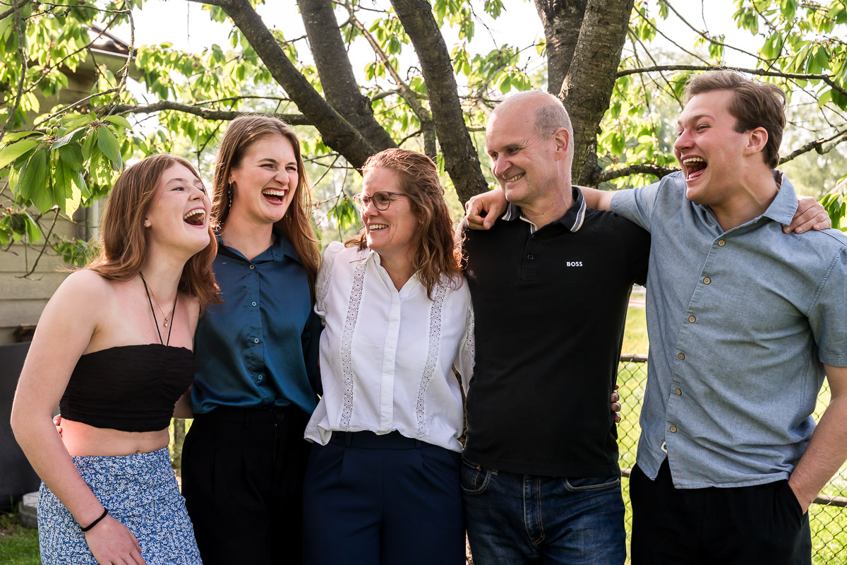 Tijdens een familieshoot geef ik kleine aanwijzingen en stel vragen, waardoor er interactie en verbinding ontstaat. Geen geforceerde glimlach, maar echte verbinding. Met veel lol, want het moet vooral ook een leuke ervaring zijn met elkaar.